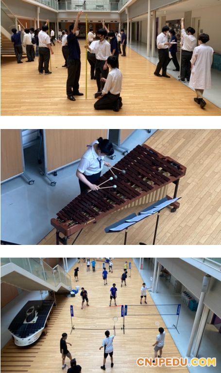 在这个中庭里可以活动和上课。下面的照片是中野校长拍摄。可以看到在这里能自由地打羽毛球、演奏音乐、还能做理科实验。