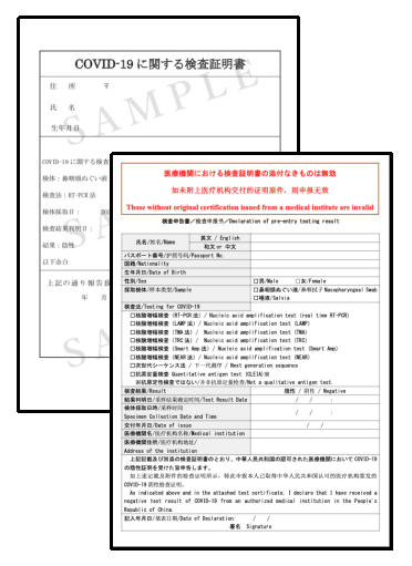 検査方法が要件と違うという理由で、日本国籍者が入国できず出国先へ強制送還される事例がありました。「検査証明」は、日本国外務省のホームページに記載された所定のフォーマットに添付する必要があります。出国前の検査や検査証明を記載するにあたっては、必ず日本の厚生労働省か在中国日本国大使館のホームページで確かめてください。
