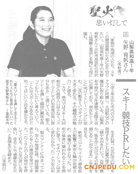 山梨英和高等学校(山梨県甲府市)高等部1年の矢野育帆(やのいくほ)さんがオリンピックの聖火ランナーとして北杜(ほくと)市を走ることになりました。矢野さんは中等部時代、スキー競技の選手として全国大会の大回転種目に3年連続で出場しています。しかし山梨県内ではスキー大回転の競技人口は少なく、聖火リレーを通してPRできればと思っています。矢野さんは平和の祭典に関われることに誇りを持っているそうです。