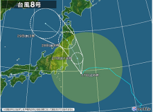 向日本关东·甲信地区移动的8号台风,目前正在向东北地区前进,预计今日傍晚至明日将登陆日本,29号将到达日本海。台风周边地区及途径地区需要做好强风、大雨警戒,台风途径方向的海域需要注意海啸。