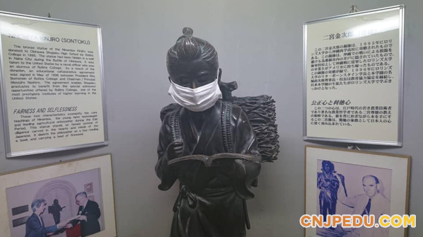 冲绳尚学高中的二宫金次郎像在战争期间,被在冲绳从军的美国罗林斯大学的学生带回了日本。之后,1995年罗林斯大学捐赠回给冲绳尚学高中。次年,罗林斯大学和冲绳尚学高中签订了教育合作协议,成为冲绳尚学高中学生们到罗林斯大学留学的契机。连接起美国和冲绳尚学高中的二宫金次郎雕像不知道被谁戴上了口罩,今天也在努力学习着。