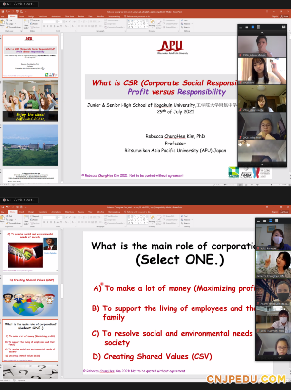 工学院大学附属中学·高中(东京都八王子市)国际课程的同学利用今年暑假,参加了立命馆亚洲太平洋大学老师的模拟授课。授课老师是来自韩国的瑞贝卡老师,采用全英语授课,同学们非常认真地听讲。学生们通过体验大学课程,可以从更多角度去思考事物。希望这些未来的栋梁之才能够积累更多的经验,有更多的想法,成为对社会有用的人。