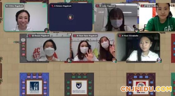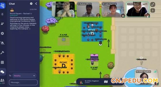 此次活动制作了线上卡通Round Square校园场景,参加者们使用虚拟形象在校园内移动。虚拟形象可以在瑜伽、猜谜、游戏、野餐等文化介绍区,以及电影院、会议室等各种各样的活动场所移动,还可以参加视频会议。当虚拟形象相遇时,就会切换成视频进行对话。