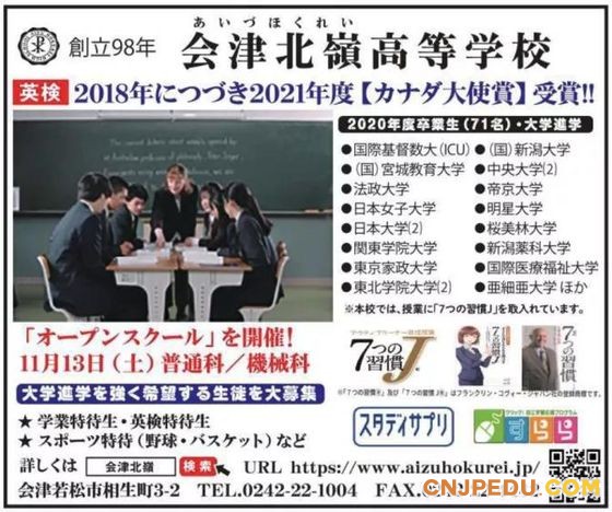 会津北岭高中(福岛县会津若松市))普通班·机械班将在下个月举行校园开放活动,招收有强烈升学意愿的学生。会津北岭凭借英语考试成绩获得了今年的“加拿大大使奖”。会津北岭设有各种优待生制度:学业优秀者、英语考试优异者、棒球、篮球特长生,都可以享受优待生待遇。