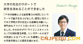 在大学老师的指导下发表了“利用PWM控制的反起电力的利用”论文并因此获得科学城堡奖,在新加坡会议上用英语发表演说
