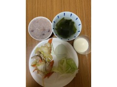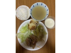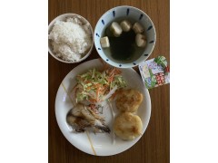 ①大阪学生宿舍(鮭の竜田揚げ,温野菜サラダ,納豆 果物,白ご飯,味噌汁(豆腐、ゴボウ、寒天),紅茶かコーヒー)(龙田炸鲑鱼