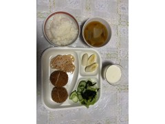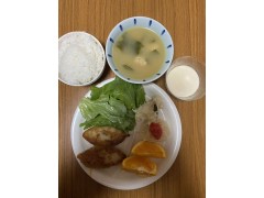 ①大阪学生宿舍(和風ミートボール,卵の目玉焼き,グリーンサラダ,赤ごはん,味噌汁(ゴボウ、ニンジン),果物、紅茶)(日式肉