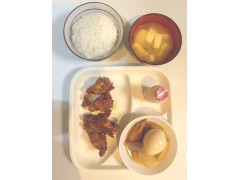 ①大阪学生宿舍(鶏肉と野菜炒め,大根の白だしさっぽり漬け,納豆、果物,赤ごはん,かぼちゃポタージュ,紅茶かコーヒー)(炒鸡