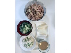 ①大阪学生宿舍(豚こまとキノコの中華丼,豆腐と水菜の中華サラダ,果物,しいたけとささみの中華スープ,緑茶かコーヒ)(猪肉蘑