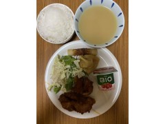 ①大阪学生宿舍(中華肉饅頭,鶏肉と根菜の煮物,目玉卵焼き,キャベツのおかか和え,果物,牛乳・お茶かコーヒー)(中华肉包子,