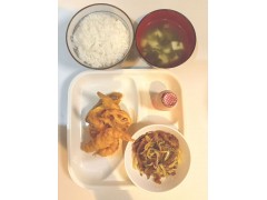 ①子安町学生宿舍(豚肉の生姜焼き,レタスサラダ,甘辛たけのこ,味噌汁,白ご飯、果物,紅茶かコーヒー)(生姜烧猪肉,生菜沙拉