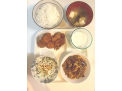 ①子安町学生宿舍(ポテトの マヨネ-ズ焼き,鶏もも肉の照り焼き,ご飯,味噌汁,果物 コーヒーか紅茶)(蛋黄酱烤土豆,照烧