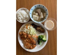 ①みつい台学生宿舍(鶏もも肉の照り焼き,キャベツサラダ,なすの焼きびたし,果物,牛乳 食パン,緑茶かコーヒ)(照烧鸡腿肉,