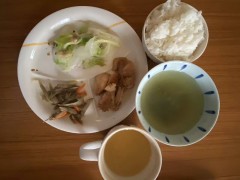 ①大阪学生宿舍(卵チャーハン,山芋とオクラの柚子胡椒きんぴら,鶏肉団子とトマトのスープ,果物,緑茶かコーヒ)(蛋炒饭,山药
